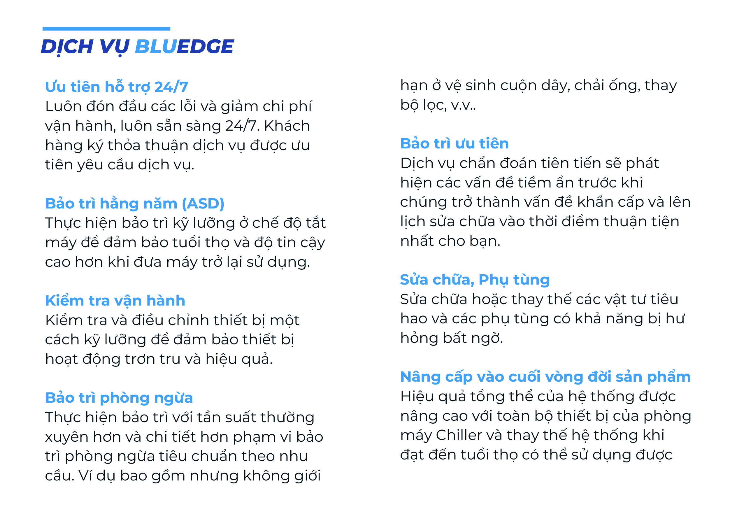 Chúng tôi cung cấp các giải pháp toàn diện xuyên suốt vòng đời sản phẩm. Các dịch vụ của chúng tôi bao gồm giám sát liên tục, bảo trì dự đoán, sửa chữa, cải tiến và nâng cấp, phụ tùng thay thế và cho thuê thiết bị. Với kế hoạch dịch vụ BluEdge tùy chỉnh, bạn có thể đảm bảo hiệu suất tối ưu và tuổi thọ bền vững cho thiết bị trong nhiều năm tới.
